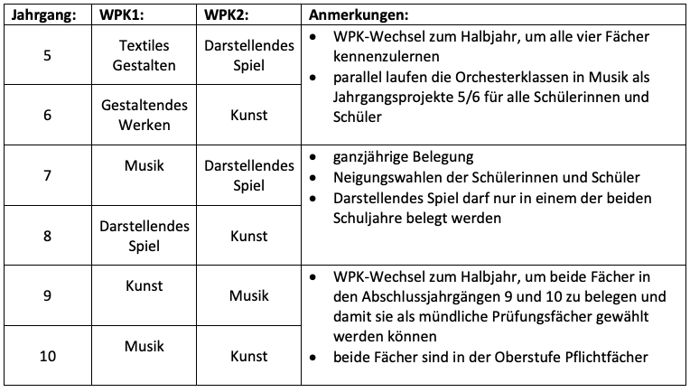 Die Schülerinnen und Schüler der Jahrgänge 5 und 6 belegen je ein Schulhalbjahr zweistündig die Fächer Textiles Gestalten, Gestaltendes Werken, Kunst und Darstellendes Spiel; parallel nehmen sie am Jahrgangsprojekt der Orchesterklassen teil. In den Jahrgängen 7 und 8 wählen sie gemäß ihren Neigungen und Interessen für je ein Schuljahr zwei der Fächer Musik, Kunst oder Darstellendes Spiel. In den Jahrgängen 9 und 10 belegen sie jeweils ein Schulhalbjahr Kunst und Musik.